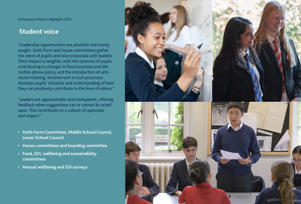 “ Leadership opportunities are plentiful and keenly sought. Sixth Form and house committees gather the views of pupils and raise proposals with leaders. Their impact is tangible, with the opinions of pupils contributing to changes in food provision and the mobile phone policy, and the introduction of antiracism training. Involvement in such processes develops pupils’ initiative and understanding of how they can positively contribute to the lives of others.”