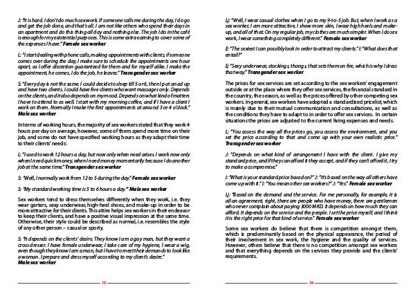 L:“ I used to work 12 hours a day, but now only when need arises. I work now only when I need quick money, when I need money momentarily because I do another job at the same time.” Transgender sex worker