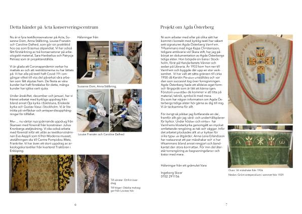 Nu är vi fyra textilkonservatorer på Acta , Susanna Oom , Anna Stålbring , Louise Franzén och Caroline Dalhed , som gör sin praktiktid hos oss som Erasmus stipendiat . Vi har också fått förstärkning av två konservatorer på arkeologiskt material , Sara Hardselius och Patrycja Petrasz som är projektanställda .
