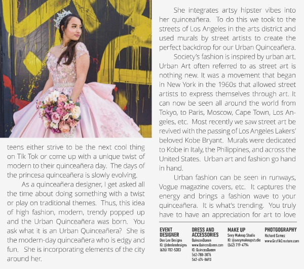 As a quinceañera designer , I get asked all the time about doing something with a twist or play on traditional themes . Thus , this idea of high fashion , modern , trendy popped up and the Urban Quinceañera was born . You ask what it is an Urban Quinceañera ? She is the modern-day quinceañera who is edgy and fun . She is incorporating elements of the city around her .