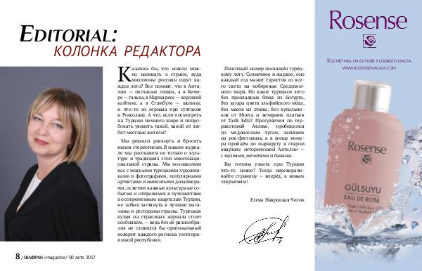 Мы решили рискнуть и бросить вызов стереотипам. В нашем журнале мы расскажем не только о культуре и традициях этой многонациональной страны. Мы познакомим вас с модными турецкими художниками и фотографами, популярными артистами и именитыми дизайнерами, осветим важные культурные события и отправимся в путешествия по современным кварталам Турции, не забыв заглянуть в лучшие магазины и рестораны страны. Турецкая кухня на страницах журнала стоит особняком,— ведь без её разнообразия не сложился бы оригинальный колорит каждого региона гостеприимной республики.