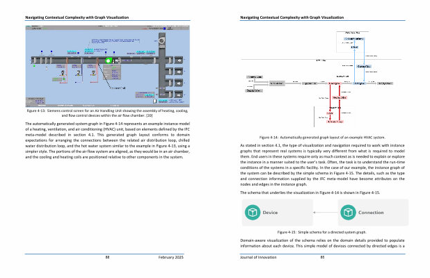 The automatically generated system graph in Figure 4-14 represents an example instance model of a heating , ventilation , and air conditioning ( HVAC ) unit , based on elements defined by the IFC meta-model described in section 4.1 . This generated graph layout conforms to domain expectations for arranging the connections between the related air distribution loop , chilled water distribution loop , and the hot water system similar to the example in Figure 4-13 , using a simpler style . The portions of the air flow system are aligned , as they would be in an air chamber , and the cooling and heating coils are positioned relative to other components in the system .