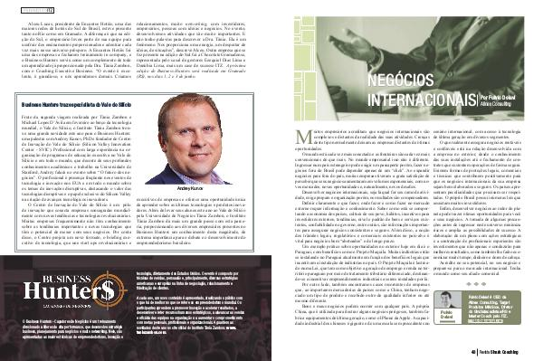 Fruto da segunda viagem realizada por Tânia Zambon e Michael Lopes D’ Ávila em fevereiro ao berço da tecnologia mundial, o Vale do Silício, o Instituto Tânia Zambon trouxe uma grande novidade este ano para o Business Hunters: uma palestra com Andrey Kunov, PhD e fundador do Centro de Inovação do Vale do Silício( Silicon Valley Innovation Center- SVIC). Profissional com larga experiência na organização de programas de educação executiva no Vale do Silício e em todo o mundo, que decorre de seus profundos conhecimentos acadêmicos e trabalho na Universidade de Stanford, Andrey falará no evento sobre“ O futuro dos negócios”. O profissional é presença freqüente nos eventos de tecnologia e inovação nos EUA e em todo o mundo sobre os temas de inovações disruptivas, destacando o valor das tecnologias disruptivas e o papel exclusivo do Silicon Valley na criação de avanços tecnológicos inovadores.