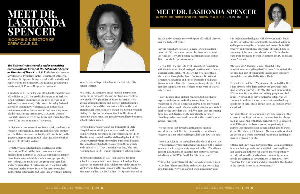 While at LA County General, she worked extensively with Dr. Jordan.“ I have an affinity and respect for everything he’ s done here. We’ ve all learned from him and my goal is to build upon that legacy with the community, build the HIV infrastructure, and lead the team in developing and implementing the strategies and protocols for HIV research and educational outreach,” she added. She is laudatory of the new team she will lead.“ To be able to learn from them and to work with them at CDU is just an honor,” she said.