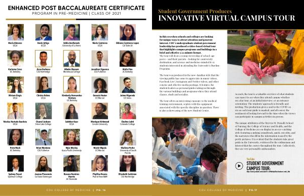 In this era when schools and colleges are looking for unique ways to attract attention and generate interest, CDU’ s undergraduate student government leadership has produced a video-based virtual tour that highlights campus programs and buildings in a brief and effective 5:22 minute format. The tour will draw a young viewership of school-age peers- and their parents- looking for a university destination, and science and medicine-minded K-12 students interested in attending the University’ s Pipeline Programs.