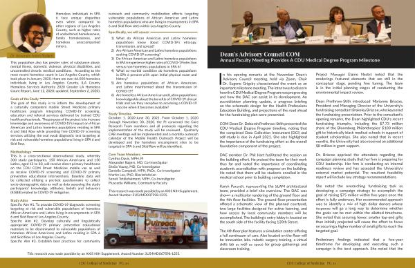 Goals of the Study The goal of this study is to inform the development of a culturally competent mobile Street Medicine primary healthcare program integrating COVID-19 screening, education and referral services delivered by trained CDU health professionals. The purpose of the project is to increase knowledge and awareness of COVID-19’ s impact on African American and Latinx homeless populations residing in SPA 6 and Skid Row while providing free COVID-19 screening services utilizing the oral swab diagnostic test targeting at risk and vulnerable homeless populations living in SPA 6 and Skid Row.
