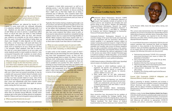 Community-Partnered Participatory Research is an essential strategy of the work that faculty and researchers conduct in alignment with the University’ s Mission. The current pandemic is an appropriate research subject to conduct community-partnered research, in light of the fact that historically, African Americans have experienced higher morbidity and mortality rates across all disease categories than any other racial / ethnic minority group in the country.( CDC, Health Disparities and Inequities Report, 2013). The pandemic has intensified the mistrust engendered in SPA 6, the service area where CDU is located. Persistent gaps in healthcare leading to Health Disparities, can be directly linked to social inequity as well as institutional racism which are entrenched within U. S. socio-political institutions.