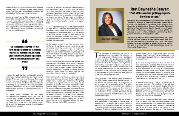 Luckily, because I was a CDU employee and I had on my CDU lab jacket with my logo. When I went up to say, I’ m here to be vaccinated, I got in right away. I filled out the paperwork, got my vaccine, waited 15 minutes for observation and I left. Kedren tailored their program to meet the needs of the community, with a late evening vaccine site where you could go at 10 or 11 o’ clock at night.