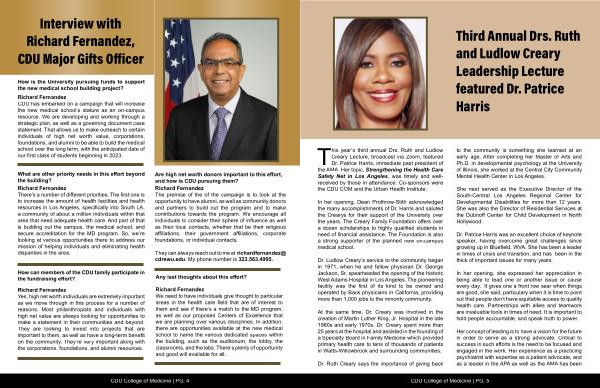This year’ s third annual Drs. Ruth and Ludlow Creary Lecture, broadcast via Zoom, featured Dr. Patrice Harris, immediate past president of the AMA. Her topic, Strengthening the Health Care Safety Net in Los Angeles, was timely and wellreceived by those in attendance. Co-sponsors were the CDU COM and the Urban Health Institute.