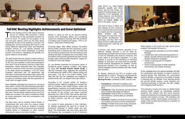 The Fall meeting of the COM Dean’ s Advisory Council on October 29th presented a variety of information for the assembled members on hand via Zoom. An update on the progress of the new four-year medical school by the three teams respectively at work on the academic curriculum, the building plan, and the fundraising effort led off. COM Family Medicine Department Chair and Residency Program Director Dr. Lisa Barkley followed with a discussion of the newly developing on-campus Centers of Excellence, highlighting the benefits of a sports medicine concentration.