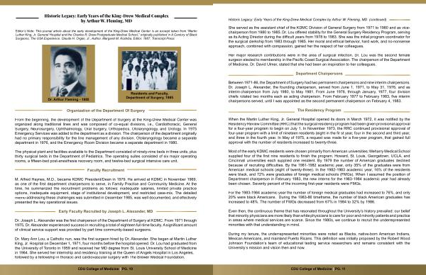 Dr. Joseph L. Alexander was the first chairperson of the Department of Surgery at KDMC. From 1971 through 1975, Dr. Alexander experienced success in recruiting a total of eighteen full-time faculty. A significant amount of clinical service support was provided by part time community-based surgeons.
