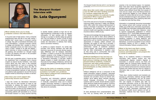 I lead the Center for Biomedical Informatics at CDU and my work focuses on ways to use informatics to address the needs of medically underserved and underresourced communities. The kind of work I’ ve done at CDU ranges from an early project examining telehealth as a means of connecting patients with specialists to my current NIH-funded research on using machine learning to identify diabetic patients at high risk for the sight-threatening complication known as diabetic retinopathy. I’ m also working with Dr. Sheba George on a project to identify safety net patients who may be hesitant to receive COVID-19 tests or vaccinations and to use a community health worker led intervention to address their testing and / or vaccination hesitancy.