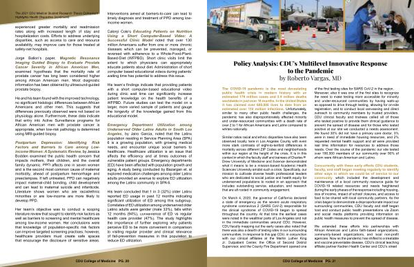 Similar ratios racial and ethnic disparities have also been observed locally here in Los Angeles County with even more stark contrasts of eight-to-tenfold differences in mortality across different ZIP Codes and neighborhoods within our region at the height of the crisis. It is in this context in which the faculty staff and trainees of Charles R. Drew University of Medicine and Science demonstrated what it means to be a mission-based Academic Health Sciences University amidst such a crisis. Specifically, our mission to cultivate diverse health professional leaders who are dedicated to social justice and health equity for underserved populations to rooted in an approach that includes outstanding service, education, and research that are all rooted in community engagement.