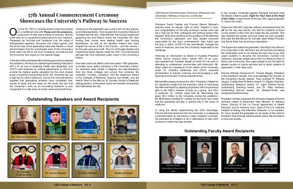 In the face of the worldwide effort that has gone into combating the pandemic, the focus on identifying the leading institutions with a fix on how to eradicate health care disparities, and CDU’ S swift response by making adjustments on the fly to provide the highest quality education for the most diverse group of students during these times, the University has set a high bar for other institutions. Just as the Commencement signaled that graduating students have completed their course of study and are ready for the world, the fact that the University’ s work as an innovating institution is now recognized in a wide array of circles came across full force.