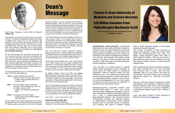 I have plenty of good news to share because of your effort and work. I am excited to highlight the progress the College of Medicine has made since our last newsletter was published. We are realizing the legacy goal of an LCME accredited MD Program at CDU. With the help of many committed faculty and staff, several new faculty recently hired, CDU executive leadership, and our many friends and supporters, we have transitioned from We CAN do this to We ARE doing this.
