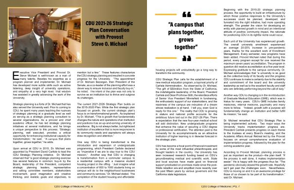 According to Provost Michael, planning process is just as important as the product— the plan itself.“ If the process is well done, it makes implementation easier.” He is happy with the progress thus far.“ The pandemic obviously slowed the growth rate. Hopefully we’ ll get past the challenges soon. Nevertheless, CDU is moving on and it is an awesome privilege for those of us chosen to be part of its transformation.” said Dr. Michael.