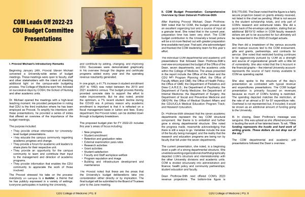 The individual COM departmental and academic unit presentations that followed Dean Prothrow-Stith’ s overview encompassed the budget of the Office of the Dean, seven departments, and the academic units within the College of Medicine. The areas presented in the report include the Office of the Dean and the CDU MD Program Planning effort; the Office of Faculty Affairs and CME; the Office of Health Policy; the Office of GME; the Department of Pediatrics and Drew C. A. R. E. S.; the Department of Psychiatry; the Department of Family Medicine; the Department of Internal Medicine; the Department of Surgery; the Department of Social and Preventive Medicine and OB / GYN; the Office of Medical Student Affairs and the CDU / UCLA Medical Education Program Track; and Research Education.