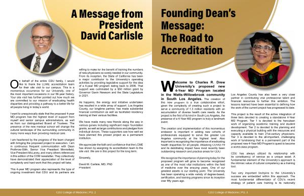 On behalf of the entire CDU family, I would like to thank the LCME accreditation team for their site visit to our campus. This is a momentous occurrence for our University, one of the most important occasions in our 56-year history. Your site visit has further pointed out how much we are committed to our mission of eradicating health disparities and providing a pathway to a better life for all people living in today’ s world.