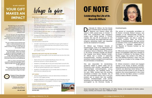Dr. Marcelle M. Willock, the first female Dean of Charles Drew University College of Medicine and Science where she retired in 2005, passed away on October 12, 2022 from complications after emergency surgery while visiting relatives in Toronto, Canada. She was 84. An advocate for civil rights and diversity, she collaborated with many programs addressing health care disparities and the fair treatment of minorities.