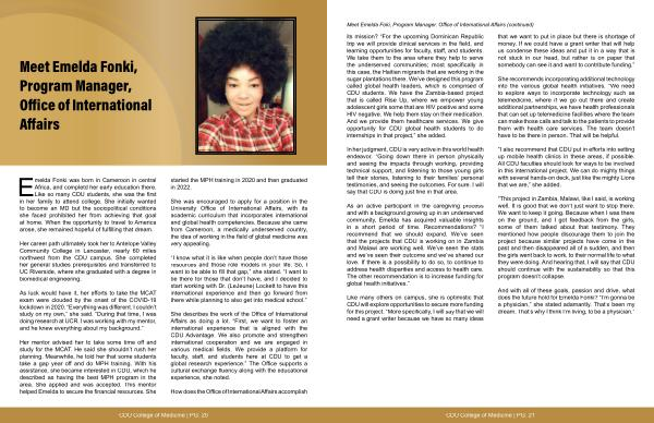 She was encouraged to apply for a position in the University Office of International Affairs, with its academic curriculum that incorporates international and global health competencies. Because she came from Cameroon, a medically underserved country, the idea of working in the field of global medicine was very appealing.