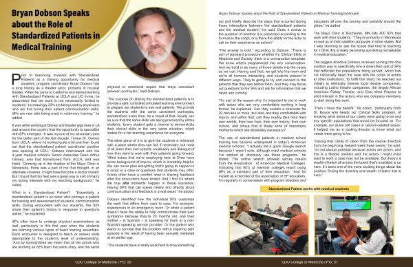 Prior to becoming involved with Standardized Patients as a training opportunity for medical students, program coordinator Bryan Dobson had a long history as a theater actor, primarily in musical theater. When he came to California and started working with Standardized Patients at UCLA and UC Irvine, he discovered that the work is not necessarily limited to students.“ Increasingly, SPs are being used by physicians who are fine tuning their patient communication skills. SPs are now also being used in veterinary training,” he added.