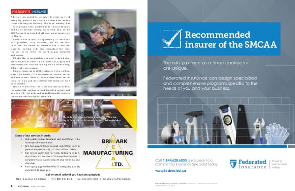 Alberta, I am excited to see what this next year will bring. My goals for our association stem from the key issues affecting our industry. This is an industry that I have proudly been involved in for almost 30 years and I am currently serving my seventh year on the SMCAA board on behalf of all sheet metal contractors in Alberta.
