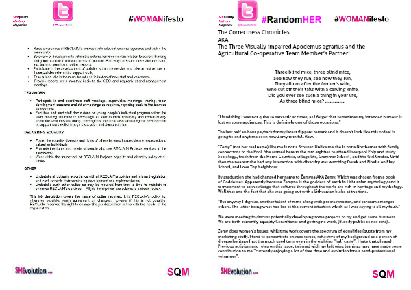 Zemy does women’s issues, whilst my work covers the spectrum of equalities (quote from my