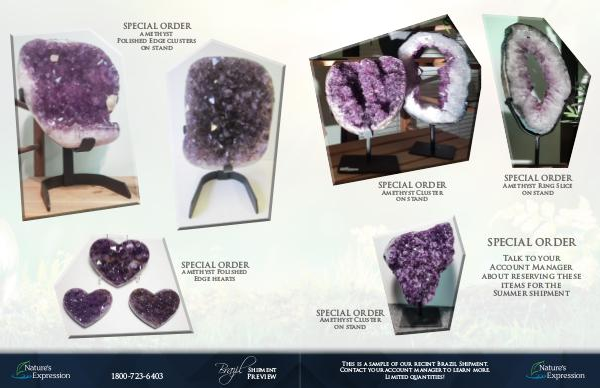 SPECIAL ORDER amethyst Polished Edge clusters on stand SPECIAL ORDER amethyst Polished Edge hearts 1800-723-6403 Brazil Preview Shipment