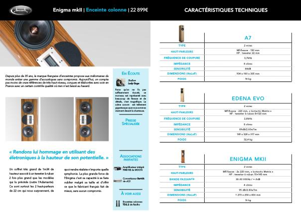 Depuis plus de 35 ans , la marque française d ’ enceintes propose aux mélomanes du monde entier une gamme d ’ acoustiques sans compromis . Aujourd ’ hui , on compte pas moins de onze références de très haut niveau , conçues et élaborées avec soin en France avec un certain contrôle qualité où rien n ’ est laissé au hasard .