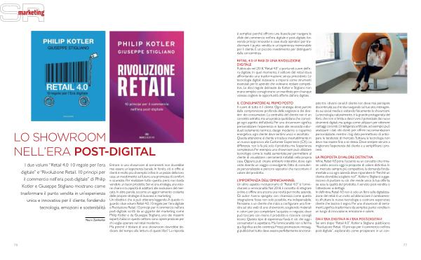 I due volumi “ Retail 4.0 . 10 regole per l ’ era digitale ” e “ Rivoluzione Retail . 10 principi per il commercio nell ’ era post-digitale ” di Philip Kotler e Giuseppe Stigliano mostrano come trasformare il punto vendita in un ’ esperienza unica e innovativa per il cliente , fondendo tecnologia , emozioni e sostenibilità
