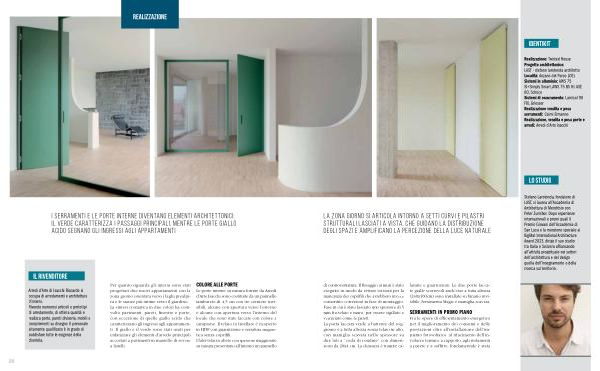 Stefano Larotonda, fondatore di LAST, si laurea all’ Accademia di Architettura di Mendrisio con Peter Zumthor. Dopo esperienze internazionali e premi quali il Premio Giovani dell’ Accademia di San Luca e la menzione speciale al BigMat International Architecture Award 2023, dirige il suo studio tra Italia e Svizzera affiancando all’ attività progettuale nei settori dell’ architettura e del design quella dell’ insegnamento e della ricerca sul territorio. di controventatura. Il fissaggio ai muri è stato eseguito in modo da evitare torsioni per la mancanza dei coprifili che avrebbero invece consentito correzioni in fase di montaggio. Fase in cui è stato lasciato uno spessore di 5 mm fra telaio e muro, per essere sigillato e verniciato come le pareti. La porta laccata verde a battente del soggiorno è a tutta altezza senza telaio in alto, con maniglia scavata nello spessore su due lati a“ coda di rondine” con dimensioni da 20x4 cm. La chiusura è tramite calamite e guarnizioni. Le due porte laccate gialle scorrevoli anch’ esse a tutta altezza( 240x100cm) sono installate su binario invisibile, ferramenta Magic e maniglia scavata.