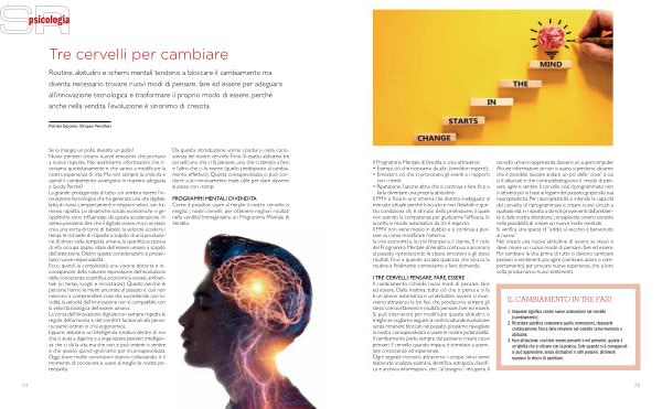 I TRE CERVELLI : PENSARE , FARE , ESSERE Il cambiamento richiede nuovi modi di pensare , fare ed essere . Dalla mattina , tutto ciò che si pensa e si fa è un ’ azione automatica e un ’ abitudine , ovvero ci muoviamo attraverso le tre fasi , che producono sempre gli stessi comportamenti e risultati : pensare , fare ed essere . Si può intervenire per modificare queste abitudini , o meglio se vogliamo seguire la nostra naturale evoluzione senza rimanere bloccati nel passato , possiamo risvegliare la nostra consapevolezza e usare le nostre potenzialità . Il cambiamento parte sempre dal pensiero : creare nuovi pensieri . Il cervello quando impara , è stimolato a assimilare conoscenze ed esperienze . Ogni segnale ricevuto attraverso i cinque sensi viene elaborato : analizza , esamina , identifica , estrapola , classifica e archivia informazioni , che , “ al bisogno ”, recupera . Il cervello umano rappresenta davvero un supercomputer . Alcune informazioni se non si usano si perdono , diciamo che è possibile lasciare andare un po ’ delle “ cose ” a cui si è attaccati e che contraddistinguono il modo di pensare , agire e sentire . Il cervello così riprogrammato non si attiverà più in base ai legami del passato , grazie alla sua neuroplasticità . Per neuroplasticità si intende la capacità del cervello di riprogrammare e creare nuovi circuiti a qualsiasi età , in risposta a stimoli provenienti dall ’ ambiente e dalla nostra intenzione consapevole ovvero consiste nella possibilità di creare un nuovo livello mentale . Si verifica una specie di “ addio al vecchio e benvenuto al nuovo ”. Nel creare una nuova abitudine di essere se stessi si deve creare un nuovo modo di pensare , fare ed essere . Per cambiare la vita , prima di tutto si devono cambiare pensieri e sentimenti , poi agire ( cambiare azioni o comportamento ) per provare nuove esperienze , che a loro volta produrranno nuovi sentimenti .