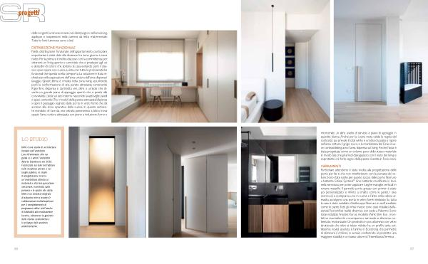 I SERRAMENTI Particolare attenzione è stata rivolta alla progettazione delle porte per far si che non interferissero con la purezza dei volumi . Sono state scelte per questo scopo delle porte filomuro a battente Eclisse Syntesis ® Line battente modificate in loco , nella serratura , per poter applicare lunghe maniglie verticali in rovere massello . Il pannello porta grezzo con primer è stato poi personalizzato e rifinito a smalto come le pareti . I due scorrevoli a scomparsa , uno in cucina e l ’ altro nella cabina armadio , accolgono una porta in vetro fumé intelaiato . Su tutta la casa è stato installato il battiscopa filomuro in mdf smaltato come le pareti . Tutti gli infissi invece sono stati installati dall ’ a- zienda TecnoInfissi realtà dinamica con sede a Palermo . Sono state installate finestre Korus , modello Wink Slim Evo montati su monoblocchi a scomparsa e serrande in alluminio coibentato , motorizzate . Un prodotto in pvc-alluminio con vetro strutturale che oltre al telaio ridotto ha un profilo anta sottilissimo ; novità assoluta è l ’ anima in Ecostrong che permette di eliminare il rinforzo in acciaio conferendo al prodotto una maggiore stabilità e un basso valore di Trasmittanza Termica .