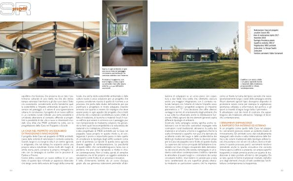 LA CASA NEL PIOPPETO : UN EQUILIBRIO DI TRADIZIONE E INNOVAZIONE Il progetto della Casa nel pioppeto di MIDE architetti nasce dalla volontà di valorizzare il contesto esistente . Scorzè , luogo in cui sorge la villa , è un centro agricolo e artigianale , che nel tempo ha scoperto anche una propria natura industriale . Come molti altri luoghi di simile storia , però , conserva la propria immagine rurale , con la campagna al confine con le province di Padova e Treviso . Come detto , costruire un nuovo edificio in un contesto di questo tipo richiede un approccio bilanciato che tenga conto della natura del luogo , della comunità locale , ma anche della sostenibilità ambientale e della cultura locale . L ’ unica soluzione per un progetto che si possa considerare riuscito è quello di ricorrere a un processo che parte dallo studio dell ’ esistente , per poi pianificare e progettare in modo adeguato , creando armonia con quanto in essere . Un impegno che deve essere posto in ogni aspetto del progetto , che si tratti di forme , stili o materiali . L ’ architettura rurale , infatti , è fatta di tradizione , di tecniche e materiali locali . Il nuovo edificio può essere in armonia con il paesaggio , pur non riproponendo le medesime soluzioni , ma giocando su temi quali l ’ ecocompatibilità o la naturalezza dei materiali e la rivisitazione di forme e volumi . L ’ idea progettuale di MIDE architetti per la Casa nel pioppeto nasce proprio in questo modo e , di conseguenza , il primo e importante passo è stato quello di considerare le tipologie degli edifici esistenti come punti di partenza . La tipicità di questa zona agricola diventa oggetto di reinterpretazione . Le peculiarità di questi edifici , che contraddistinguono l ’ area , non si perdono , ma anzi sono riproposte e rilette in chiave contemporanea . Non si tratta , quindi , di semplice emulazione , ma di far proprio un oggetto esistente e riproporlo come frutto di un processo innovativo . Il lotto d ’ intervento , lambito da un corso d ’ acqua , grazie alla sua generosa estensione permette all ’ abi-