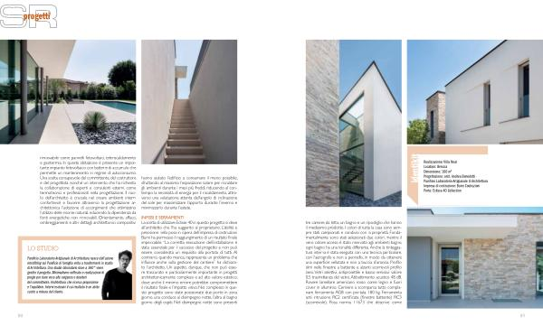 Realizzazione : Villa Noal Location : Brescia Dimensione : 160 m 2 Progettazione : arch . Andrea Benedetti - Panificio Laboratorio Artigianale di Architettura Impresa di costruzione : Burni Costruzioni Porte : Eclisse 40 Collection tre camere da letto , un bagno e un ripostiglio che hanno il medesimo prodotto . I colori di tutta la casa sono sempre stati campionati e condivisi con la proprietà . Fondamentalmente sono stati selezionati due colori , mentre il vero colore acceso è stato riservato agli ambienti bagno , ogni bagno ha una tonalità differente . Anche la tinteggiatura interna è stata eseguita con una tecnica particolare , con l ’ aerografo e non a pennello , in modo da ottenere una superficie vellutata e non a buccia d ’ arancia . Profilo slim nelle finestre a battente e alzanti scorrevoli profilo zero . Vetri selettivi , antiproiettile e basso emissivi valore 0,5 trasmittanza del vetro . Abbattimento acustico 48 dB . Rovere lamellare americano rosso come legno e fuori cover in alluminio . Cerniere a scomparsa tutto complanare ferramenta AGB con portata 180 kg . Ferramenta anti intrusione RC2 certificata ( finestre battente ) RC3 ( scorrevole ). Posa norma 11673 che descrive come