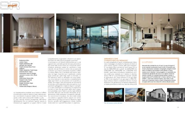 re completamente proiettata verso l ’ esterno . L ’ effetto di continuità tra interno / esterno è stato ottenuto grazie a serramenti di sezione ridotta che creano una quinta a tutto vetro senza profili metallici a vista . La luce naturale diventa protagonista dell ’ interno dell ’ abitazione fino al tramonto quando assume le sfumature più suggestive . Lo spazio interno è stato