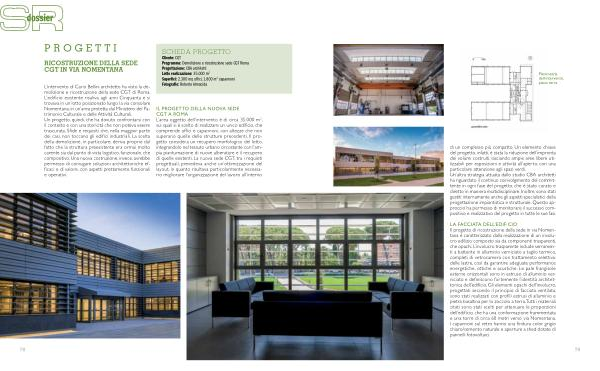 LA FACCIATA DELL ’ EDIFICIO Il progetto di ricostruzione della sede in via Nomentana è caratterizzato dalla realizzazione di un involucro edilizio composto sia da componenti trasparenti , che opachi . L ’ involucro trasparente include serramenti a battente in alluminio verniciato a taglio termico , completi di vetrocamera con trattamento selettivo delle lastre , così da garantire adeguate performance energetiche , ottiche e acustiche . Le pale frangisole esterne orizzontali sono in estruso di alluminio verniciato e definiscono fortemente l ’ identità architettonica dell ’ edificio . Gli elementi opachi dell ’ involucro , progettati secondo il principio di facciata ventilata , sono stati realizzati con profili estrusi di alluminio e pietra basaltina per lo zoccolo a terra . Tutti i materiali citati sono stati scelti per attenuare le proporzioni dell ’ edificio , che ha una conformazione frammentata e una torre di circa 60 metri verso via Nomentana . I capannoni sul retro hanno una finitura color grigio chiaro / cemento naturale e aperture a shed dotate di pannelli fotovoltaici .