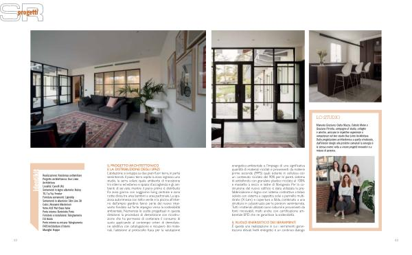 IL PROGETTO ARCHITETTONICO E LA DISTRIBUZIONE DEGLI SPAZI L’ abitazione si sviluppa su due piani fuori terra, in parte seminterrati. Il piano terra ospita la zona ingresso, uno studio, la serra solare quale ambiente di transizione tra interno ed esterno e spazio d’ accoglienza e gli ambienti di servizio, mentre il piano primo è distribuito fra zona giorno con soggiorno living centrale e zona notte divisa tra area bambini e area padronale. La spaziosa autorimessa con tetto verde e la piscina all’ interno dell’ ampio giardino fanno parte del nuovo intervento fondato sul forte impegno verso la sostenibilità ambientale. Numerose le scelte progettuali in questa direzione: la procedura di demolizione con ricostruzione che ha permesso di contenere il consumo di suolo applicando al contempo criteri di demolizione selettiva con catalogazione e recupero dei materiali, l’ adesione al protocollo Itaca per la valutazione