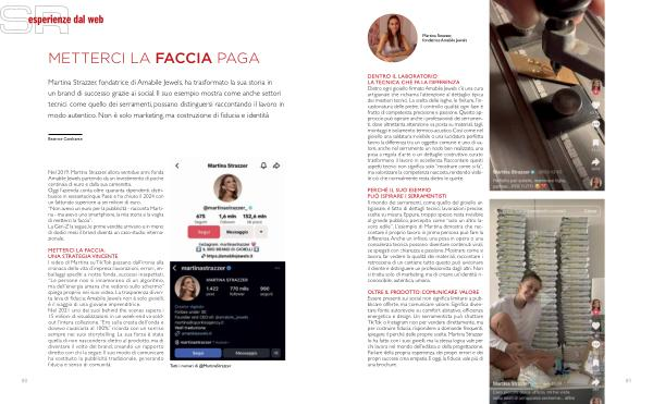 METTERCI LA FACCIA: UNA STRATEGIA VINCENTE I video di Martina su TikTok passano dall’ ironia alla cronaca della vita d’ impresa: lavorazioni, errori, imballaggi spediti a notte fonda, successi inaspettati.“ Le persone non si innamorano di un algoritmo, ma dell’ energia umana che vedono sullo schermo” spiega proprio nei suoi video. La trasparenza diventa leva di fiducia: Amabile Jewels non è solo gioielli, è il viaggio di una giovane imprenditrice. Nel 2021 uno dei suoi behind the scenes supera i 15 milioni di visualizzazioni: in un week-end va soldout l’ intera collezione.“ Ero sulla cresta dell’ onda e dovevo cavalcarla al 100 %” ricorda con un sorriso sempre nei suoi storytelling. La sua forza è stata quella di non nascondersi dietro al prodotto, ma di diventare il volto del brand, creando un rapporto diretto con chi la segue. Il suo modo di comunicare ha sostituito la pubblicità tradizionale, generando fiducia e senso di comunità.