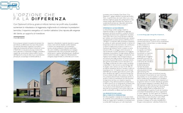 Con Opzione-K di Korus , grazie al rinforzo termico nei profili anta , è possibile aumentare la robustezza e la leggerezza , migliorando al contempo le prestazioni termiche , il risparmio energetico e il comfort abitativo . Una risposta alle esigenze del cliente , un supporto al rivenditore