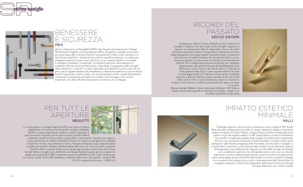 pba ha collaborato con RainlightSTUDIO e Kay Sargent ( Consulente per il Design del Benessere Cognitivo e Sensoriale ), per offrire una gamma completa di accessori per porte disponibili in diverse forme , in una pressoché infinita scelta cromatica e in due finiture superficiali - texture : forma , colore e superficie diventano un mezzo per progettare spazi più inclusivi e per tutti . Tocco è una capsule collection di maniglie e maniglioni sostenibili e componibili con elementi sensoriali intercambiabili . La collezione offre due diverse texture : liscia e sfaccettata . L ’ impugnatura delle maniglie della collezione è in Econyl ® , un nylon rigenerato da materiale di scarto come reti da pesca , vecchi tappeti destinati allo smaltimento , componenti plastiche e scarti di tessuto . Econyl ® è piacevole e caldo al tatto , con una temperatura simile a quella dell ’ ambiente circostante . La sensazione percepita nel contatto con la maniglia è uno stimolo importante , che deve infondere benessere e sicurezza a chi la impugna .