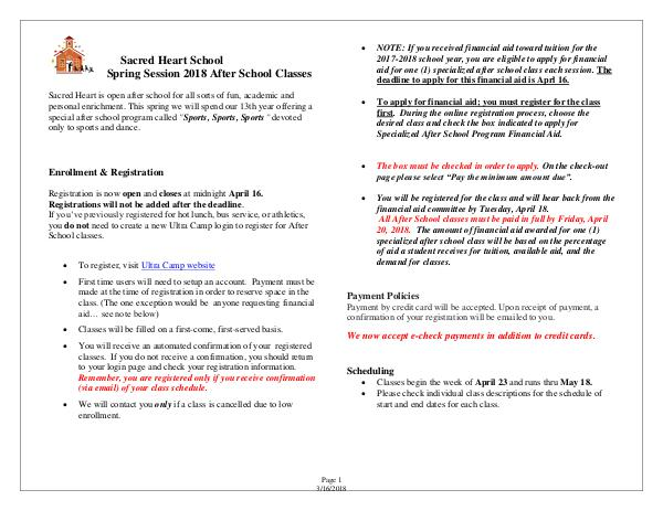 SHS After School Program - Fall Session II Classes 2018 Spring Session