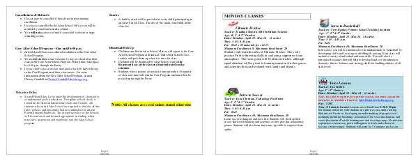 Teachers: Terri Bender, Primary School Teaching Assistant Age: 1 st, 2 nd & 3 rd Graders Dates: Mondays, April 23- May 14( 4 weeks) Time: 3:45 – 4:45 p. m. Fee: $ 112 Minimum Enrollment: 10; Maximum Enrollment: 20 In this class you will be introduced to the fundamentals of basketball by developing skills and focusing on dribbling & passing. Each class will include a variety of individual and team drills. You will also be introduced to games that will help to develop hand-eye coordination, dexterity, fitness, balance, and strategy skills for budding athletes of all skill levels.