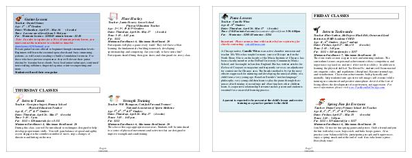 Teacher: Camille Witos Age: K- 8 th Graders Dates: Thursdays, April 26 – May 17( 4 weeks) Time:( 30 / 45-minute lessons) Lessons are offered from 3:30-6:00pm Fee: 30 minutes- $ 208 / 45 minutes- $ 284