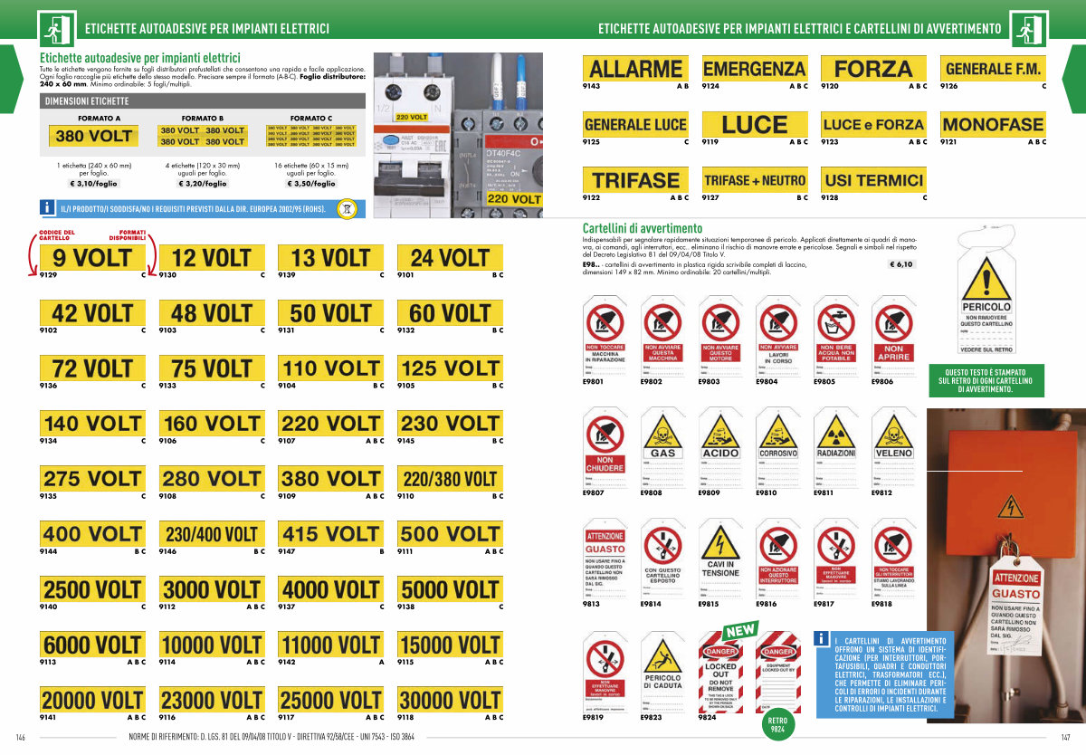 I CARTELLINI DI AVVERTIMENTO OFFRONO UN SISTEMA DI IDENTIFI- CAZIONE( PER INTERRUTTORI, POR- TAFUSIBILI, QUADRI E CONDUTTORI ELETTRICI, TRASFORMATORI ECC.), CHE PERMETTE DI ELIMINARE PERI- COLI DI ERRORI O INCIDENTI DURANTE LE RIPARAZIONI, LE INSTALLAZIONI E CONTROLLI DI IMPIANTI ELETTRICI. |