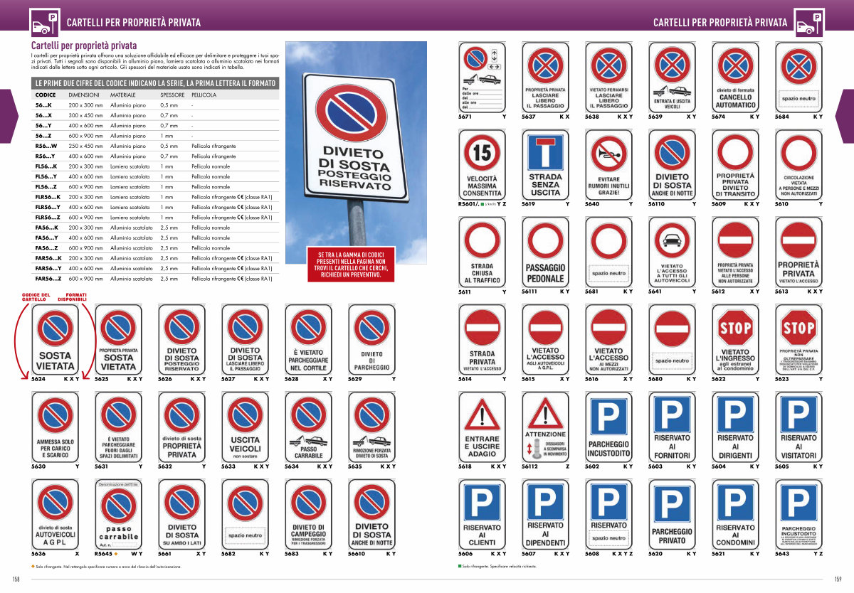 I cartelli per proprietà privata offrono una soluzione affidabile ed efficace per delimitare e proteggere i tuoi spazi privati. Tutti i segnali sono disponibili in alluminio piano, lamiera scatolata o alluminio scatolato nei formati indicati dalle lettere sotto ogni articolo. Gli spessori del materiale usato sono indicati in tabella.