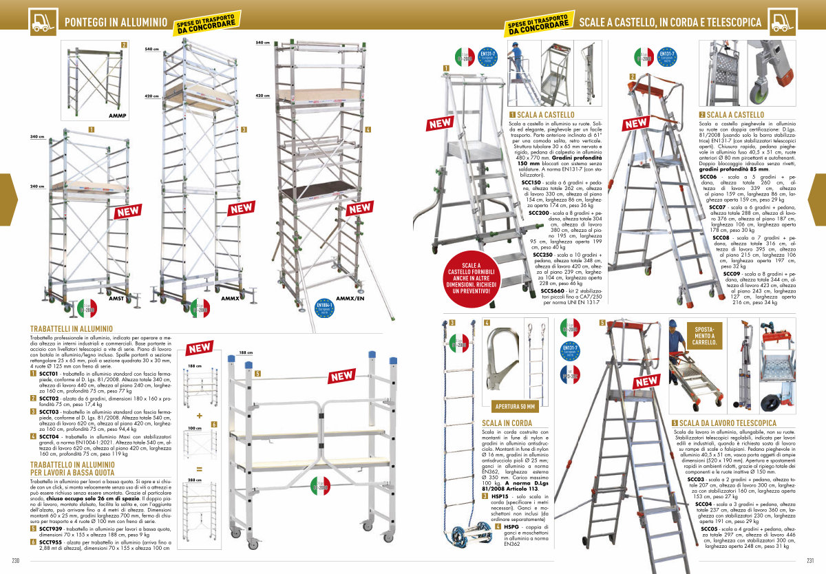 Trabattello in alluminio per lavori a bassa quota. Si apre e si chiude con un click, si monta velocemente senza uso di viti o attrezzi e può essere richiuso senza essere smontato. Grazie al particolare snodo, chiuso occupa solo 26 cm di spazio. Il doppio piano di lavoro, montato sfalsato, facilita la salita e, con l’ aggiunta dell’ alzata, può arrivare fino a 4 metri di altezza. Dimensioni montanti 60 x 25 mm, gradini larghezza 700 mm, fermo di chiusura per trasporto e 4 ruote Ø 100 mm con freno di serie.