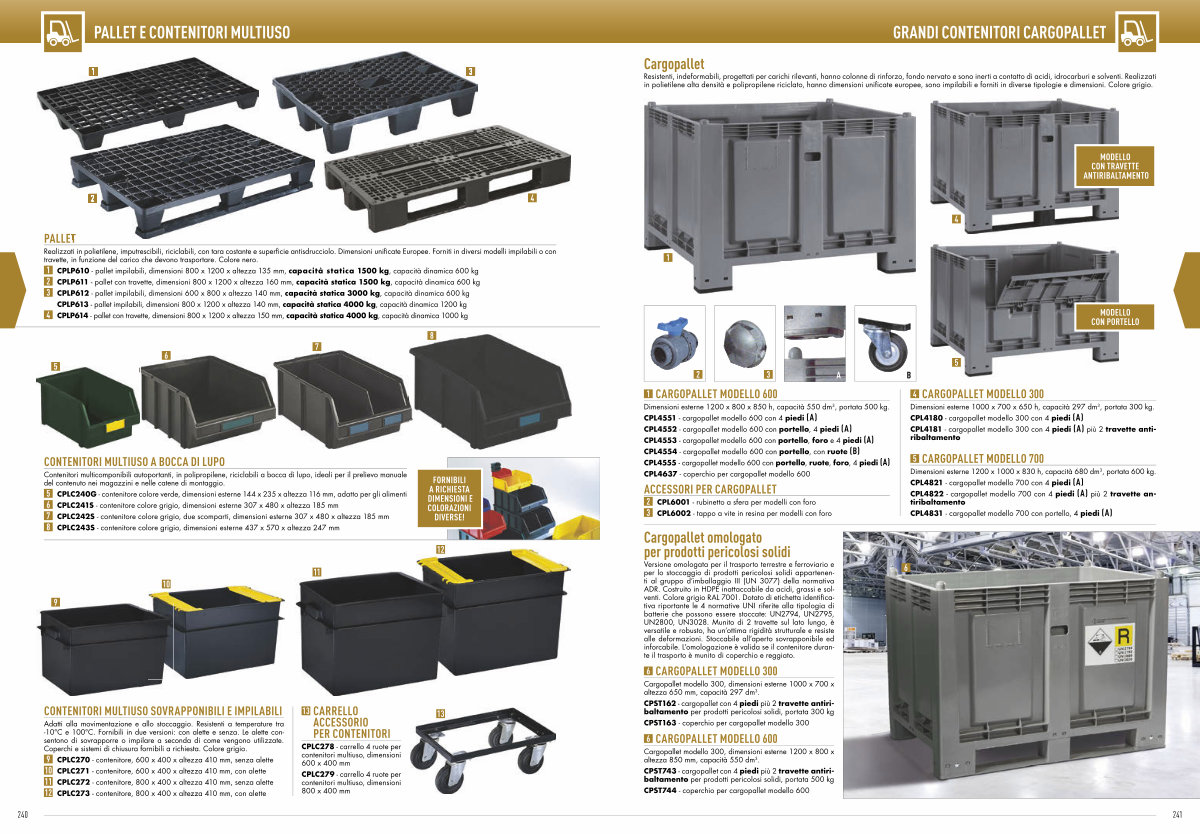 Resistenti, indeformabili, progettati per carichi rilevanti, hanno colonne di rinforzo, fondo nervato e sono inerti a contatto di acidi, idrocarburi e solventi. Realizzati in polietilene alta densità e polipropilene riciclato, hanno dimensioni unificate europee, sono impilabili e forniti in diverse tipologie e dimensioni. Colore grigio.