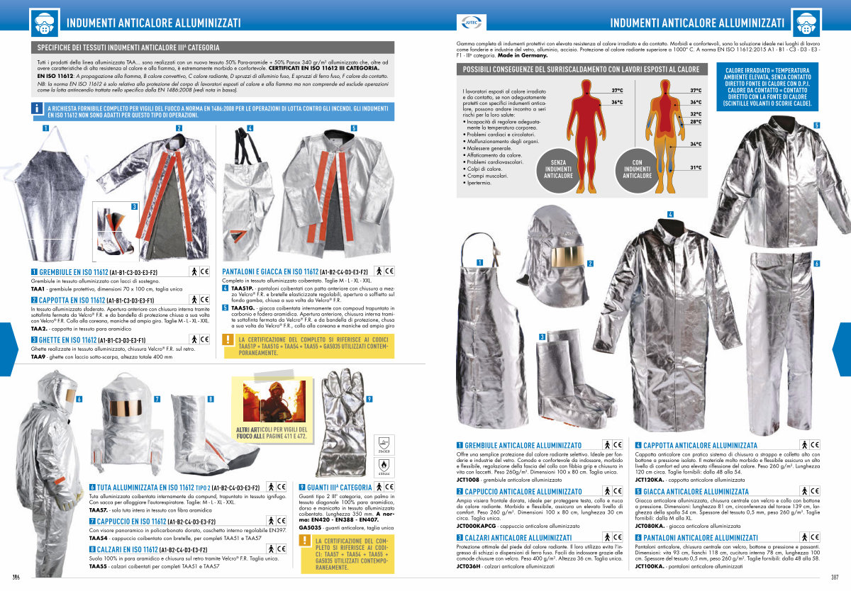 Tutti i prodotti della linea alluminizzata TAA... sono realizzati con un nuovo tessuto 50 % Para-aramide + 50 % Panox 340 gr / m 2 alluminizzato che, oltre ad avere caratteristiche di alta resistenza al calore e alla fiamma, è estremamente morbido e confortevole. CERTIFICATI EN ISO 11612 III CATEGORIA.