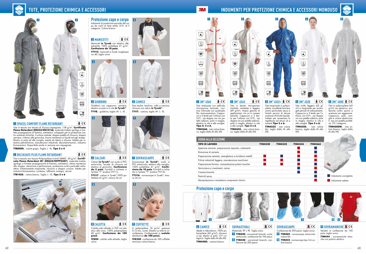 Tuta realizzata con pellicola microporosa laminata, cuciture rinforzate con quadruplo filo, termonastratura. Cappuccio a 3 lembi per l’ utilizzo con D. P. I., zip doppia via con patella adesiva, polsi in maglia, elastico in vita e alle caviglie. Tipo 4, 5 e 6.
